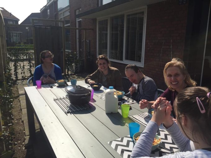 En ja, als het dan zomaar in het voorjaar heel erg lekker weer is, dan is het natuurlijk bijna niet te weerstaan om buiten in het zonnetje te eten. Als dat dan ook nog samen valt met een kookactiviteit, wordt er buiten een heerlijk bordje macaroni genuttigd. Zo dat was wel even smullen van de macaroni, maar ook van het heerlijke voorjaarszonnetje.